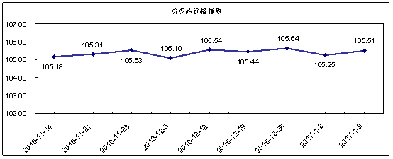 “中国·柯桥纺织指数” 20170109期纺织品价格指数收报于105.51点,环比上涨0.25%,较年初上涨0.25%,同比上涨1.30%。