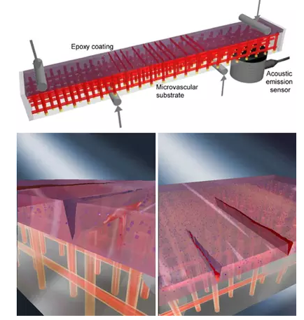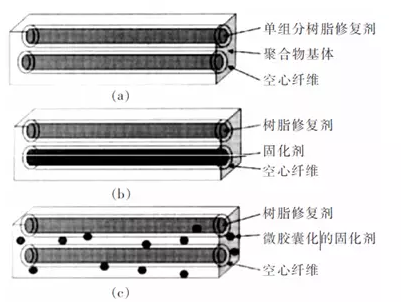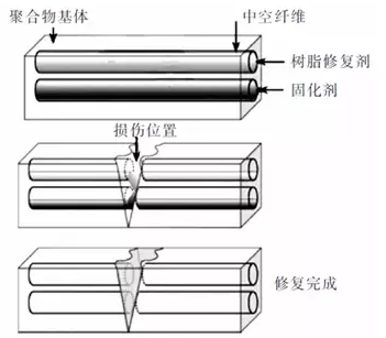 中空纤维自修复方法的修复机理是将中空纤维埋植在基体材料中,空心纤维内装有修复剂流体,材料发生破坏时通过释放空心纤维内的修复剂流体粘接裂纹处实现损伤区域自修复。