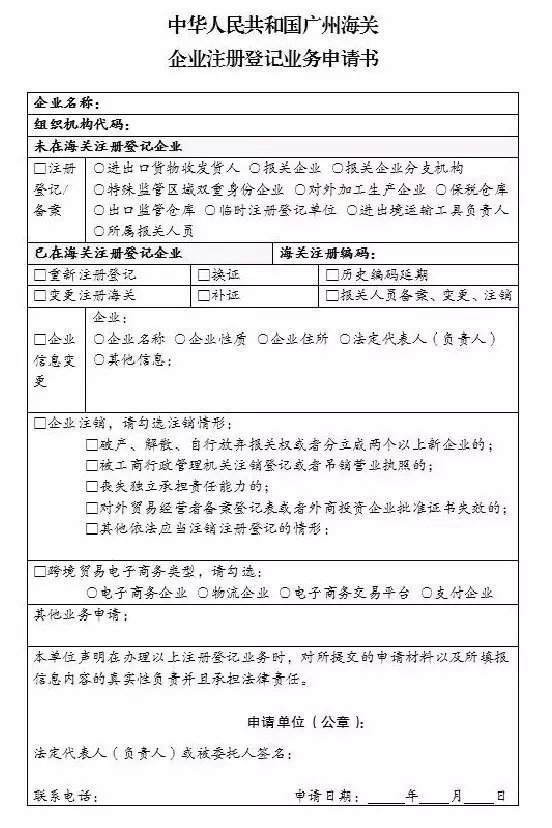 《企业注册登记业务申请书》可在广州海关互联网站下载,企业填写企业名称、组织机构代码;勾选已在海关注册登记企业,填写海关注册编码,勾选“补证”,并由法人签名,在“申请单位”处加盖企业公章,填写联系电话、申请日期。
