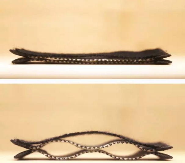 织物中置入两种不同的热膨胀材料,当温度上升时,这两种材料的长度因热膨胀性能不同而产生不同,进而引起织物弯曲变厚。