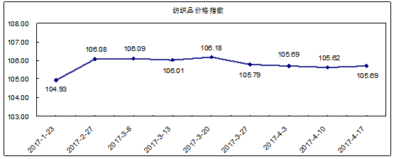 “中国·柯桥纺织指数” 20170417期纺织品价格指数收报于105.69点,环比上涨0.07%,较年初上涨0.42%,同比上涨1.38%。