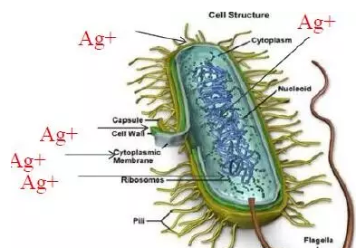 银离子本身带有正电荷,大多数情况下微生物所生存环境的酸碱环境通常都大于其等电点,所以其表面通常带负电荷。在库仑引力的作用,两者相吸。当银离子在微生物表面蓄积到一定浓度时,它就可以有效击穿微生物的细胞壁,并渗透到微生物细胞内与其蛋白质上的巯基发生反应,使微生物蛋白质凝固,导致蛋白酶失活,从而使微生物细胞丧失分裂、繁殖的能力。同时银离子还具有较高的氧化还原电位,在光的作用下,激活水和空气中氧,产生的活性氧在短时间内破坏细菌的增值能力,从而极大地提高抗菌效果。