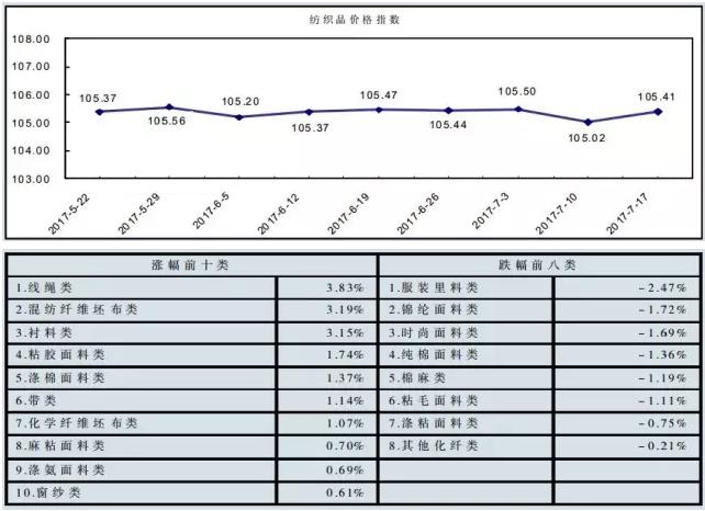 “中国·柯桥纺织指数” 20170717期纺织品价格指数收报于105.41点,环比上涨0.37%,较年初上涨0.15%,同比上涨0.93%。近期,中国轻纺城市场营销环比回升,其中,原料市场行情小幅上涨,坯布市场价量环比回升,服装面料市场布匹价量小幅回升,家纺类面料成交价量小幅上涨,辅料行情小幅回升。