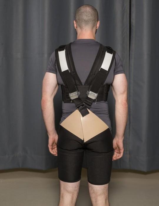 上周研究人员在澳大利亚布里斯班举行的国际生物力学学会大会上公布了他们的研究成果,轻质的两部分装备由尼龙帆布、莱卡、涤纶和其他材料组成。两条带子从顶部和背面向下移动,与下边的天然橡胶片相连。