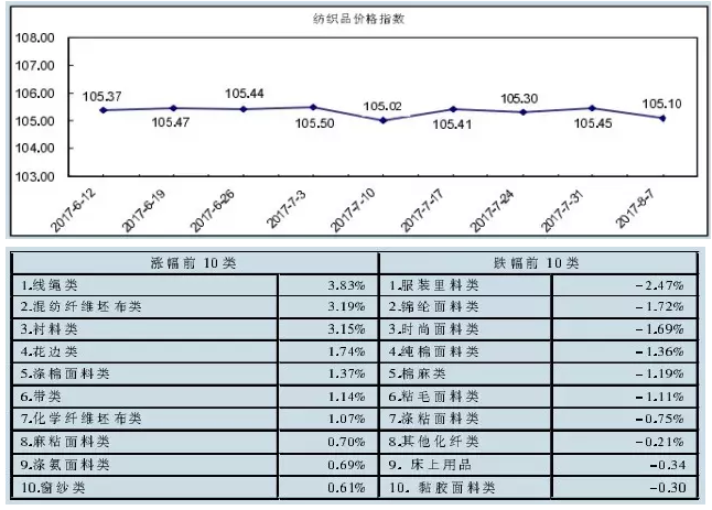“中国·柯桥纺织指数” 20170807期纺织品价格指数收报于105.10点,环比下跌0.33%,较年初下跌0.14%,同比上涨0.15%。据统计月报显示,2017年7月中国轻纺城纺织品市场成交量为38323万米,环比下跌7.32%,同比上涨7.12%。1~7月累计总成交量320466万米,同比上涨6.75%。7月中国轻纺城纺织品市场成交额为599763万元,环比下跌6.98%,同比上涨11.99%。1~7月累计总成交额4964893万元,同比上涨10.02%。近期,中国轻纺城市场营销振荡回落,其中,原料市场行情小幅下跌,坯布市场价量环比下跌,服装面料市场布匹价量小幅回落,家纺类面料成交价量小幅下跌,辅料行情小幅回升。