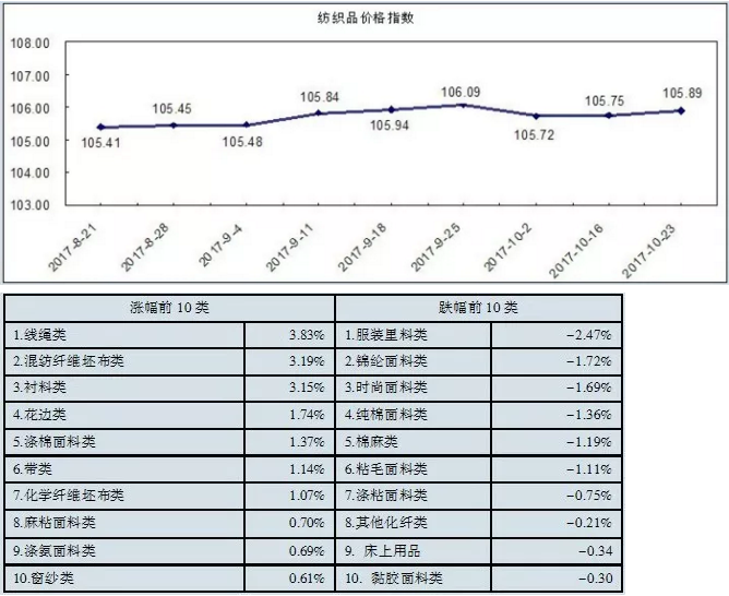 “中国·柯桥纺织指数” 20171023期纺织品价格指数收报于105.89点,环比上涨0.13%,较年初上涨0.61%,同比上涨0.72%。借纺博会东风,近期中国轻纺城秋市行情振荡推升,其中,原料市场行情微势回升,坯布市场价量小幅回升,服装面料市场布匹价量小幅推升,家纺类面料成交价量小幅下跌,辅料行情小幅回升。