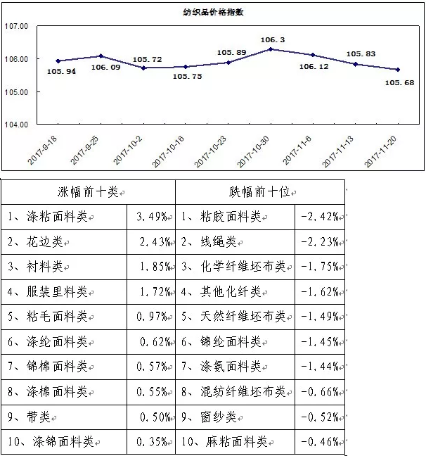 “中国•柯桥纺织指数” 20171120期纺织品价格指数收报于105.68点,环比下跌0.14%,较年初上涨0.41%,同比上涨0.35%。 近期,中国轻纺城市场营销仍显回缩,其中:原料市场行情小幅下跌,坯布市场价量环比回落,服装面料市场布匹价量小幅回升,家纺类面料成交价量小幅下跌,辅料行情环比回升。