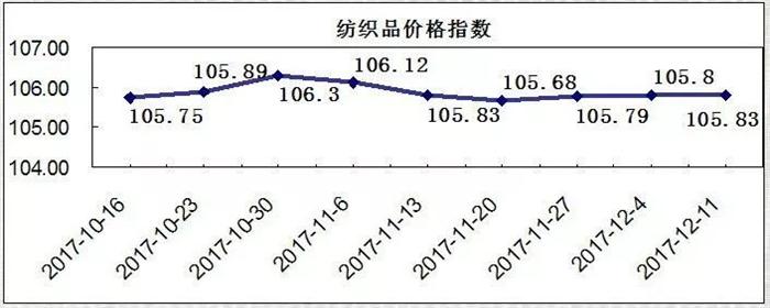 “中国·柯桥纺织指数”20171211期纺织品价格指数收报于105.83点,环比上涨0.03%,较年初上涨0.55%,同比上涨0.27%。近期,中国轻纺城市场营销震荡小升,其中,原料市场行情微幅上涨,坯布市场价量小幅下跌,服装面料市场布匹价量小幅上涨,家纺类面料成交价量小幅下跌,辅料行情环比回缩。